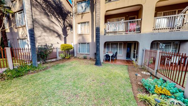 Outside, residents can enjoy a small private garden area, perfect for outdoor relaxation or entertaining. The apartment complex is surrounded by lush landscaping, including palm trees and well-maintained lawns, creating a great living atmosphere.