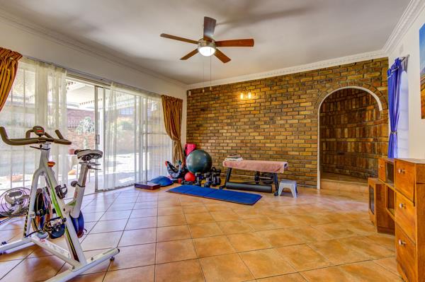 Living areas consist of an elegant lounge, dining room and family room with underfloor heating. There is an additional room which is currently used as an entertainment room with fitted bar. This room has its own bathroom and entrance which could be an easy conversion to a granny flat or work from home office. In addition to this there is an enclosed undercover braai room with stack doors opening onto the beautiful sparkling pool set in an established pretty garden.