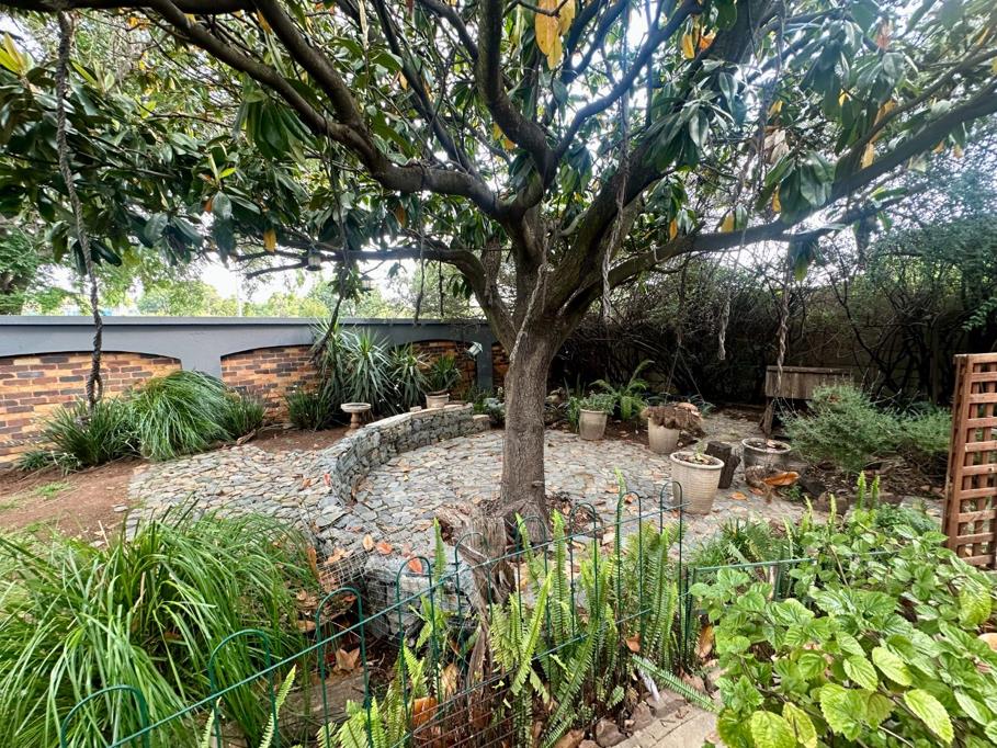 The exterior boasts extensive outdoor amenities designed for practicality and leisure. A cobblestone-style paved driveway leads to a large covered carport, accommodating up to six vehicles, including a dedicated garage. The established garden features mature trees, a stone-paved patio with unique gabion-style seating, and diverse plantings, creating a serene environment. Additional features include staff quarters and an outbuildingshed for extra storage.