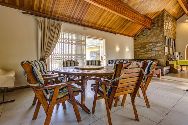 Step inside to a meticulously designed interior featuring two expansive lounges and a dedicated dining room, perfect for both intimate family gatherings and grand entertaining. The dining area boasts a distinctive wooden slatted ceiling and a captivating stone-clad accent wall, adding unique character. The functional kitchen, equipped with extensive wooden cabinetry, tiled flooring, and a convenient pass-through window, offers abundant storage and preparation space, catering to culinary enthusiasts.