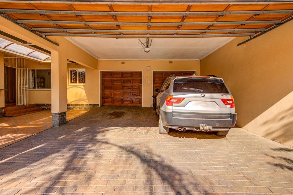 Discover an exquisite family residence nestled in the esteemed suburb of Farrarmere, Benoni, South Africa. This magnificent property, spanning a generous 992 sqm erf with a substantial 390 sqm under roof, offers a lifestyle of unparalleled comfort and sophisticated living. The grand entrance, secured by an ornate wrought iron gate, brick pillars, and electric fencing, is framed by mature palm trees and a brick-paved driveway, leading to a double garage and covered carport, providing ample secure parking for up to four vehicles.