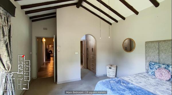 The right wing of the home houses all four bedrooms. The first three spacious bedrooms offer serene garden views and built-in cupboards, easily accommodating double or queen beds. A full bathroom services these rooms. The main bedroom is privately positioned in the corner of the home, showcasing peaceful garden and pool views, a walk-through closet, and a full ensuite bathroom.