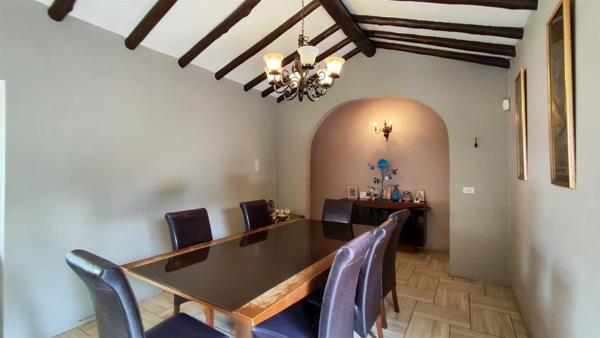 The open-plan dining area flows seamlessly from the kitchen, creating the perfect space for family meals. A short passage leads to the lounge, which opens onto the front garden and features a wood-burning fireplace unused. Just off the entrance, a cosy entertainment room with high ceilings, a fitted solid-wood bar, and soft carpeting provides an ideal retreat for hosting guests or relaxing evenings.