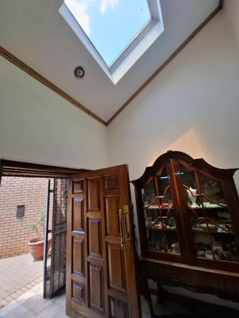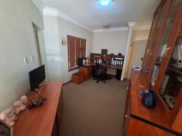 Step inside through a solid wooden front door into an inviting entrance hall, featuring high ceilings and abundant natural light from a skylight. The interior boasts versatile living spaces, including two spacious lounges and a dedicated dining room, perfect for both relaxation and entertaining. A functional home office, complete with crown molding, offers an ideal environment for productivity or study.