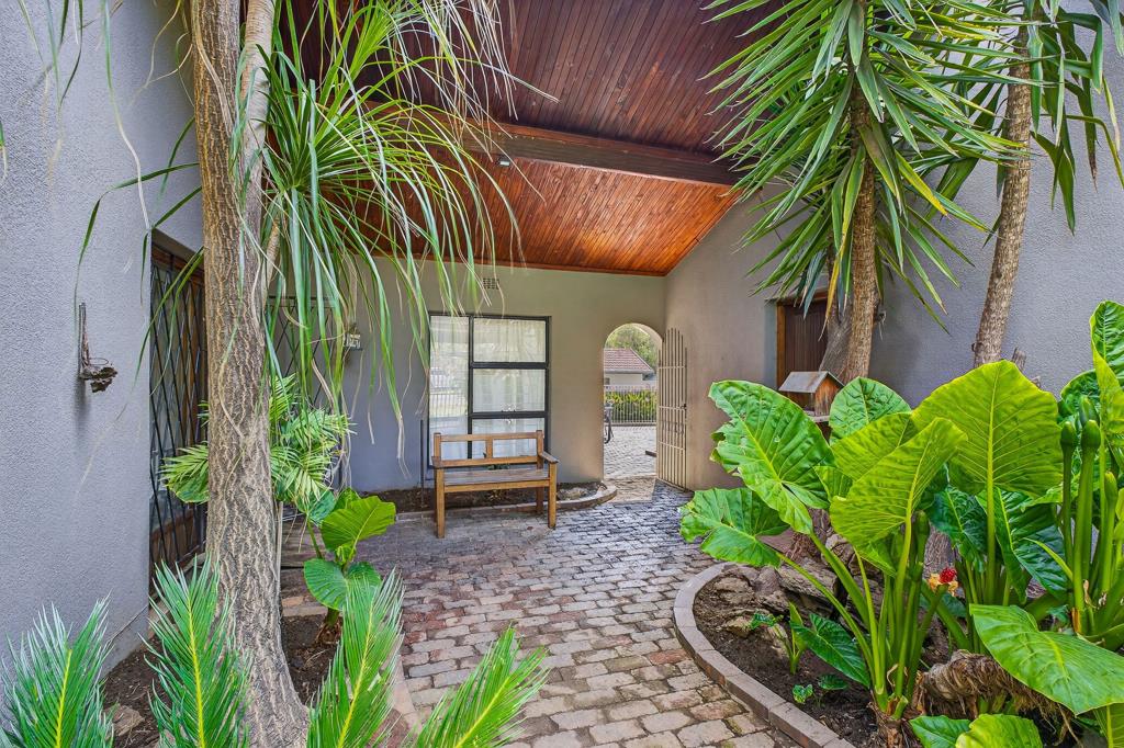 The bedrooms are situated down a private passage. The first bedroom currently used as a study is carpeted, spacious, and enjoys views of the front garden, complete with built-in cupboards and shelving. The second and third bedrooms comfortably accommodate a queen-sized bed, offer vinyl flooring, and include built-in cupboards. They share a modern bathroom fitted with a shower, loo, and vanity. Centrally positioned among the bedrooms is an above-average-sized second living room, offering backyard views and direct access to the pool through sliding doors a perfect space for a TV lounge, playroom, or relaxed family area.