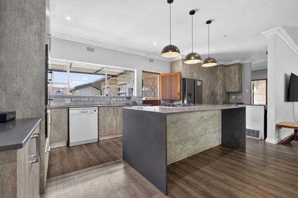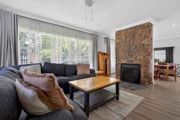 The entrance leads directly into the main living area, where vinyl flooring runs throughout the open-plan lounge, dining room and kitchen, all warmed by a central wood fireplace. The kitchen is modern and practical, featuring Caesarstone countertops, a gas stove, space for a double-door fridge with a water outlet, and room for two undercounter appliances. It flows out to the sunny backyard, which includes a storeroom for added convenience.