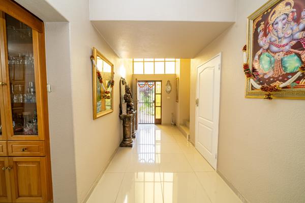 The layout is split across a well-designed duplex, offering five bedrooms and three bathrooms, making it ideal for larger families or those who simply refuse to feel cramped. Upstairs, two bedrooms with built-in cupboards share a bathroom, with one opening onto a private balcony, a quiet escape that feels removed from the rest of the home. Downstairs, three additional bedrooms are supported by two bathrooms, including a main en-suite, creating a practical separation between living and resting spaces.