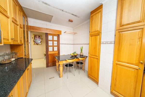 The living areas are generous without feeling excessive. A spacious lounge anchors the home, while the dining room flows naturally out to a patio, extending the living space outdoors. The kitchen is built for actual use, granite countertops, a double eye-level oven, double sink, and a separate scullery that handles the mess, the laundry, and the overflow without getting in your way.