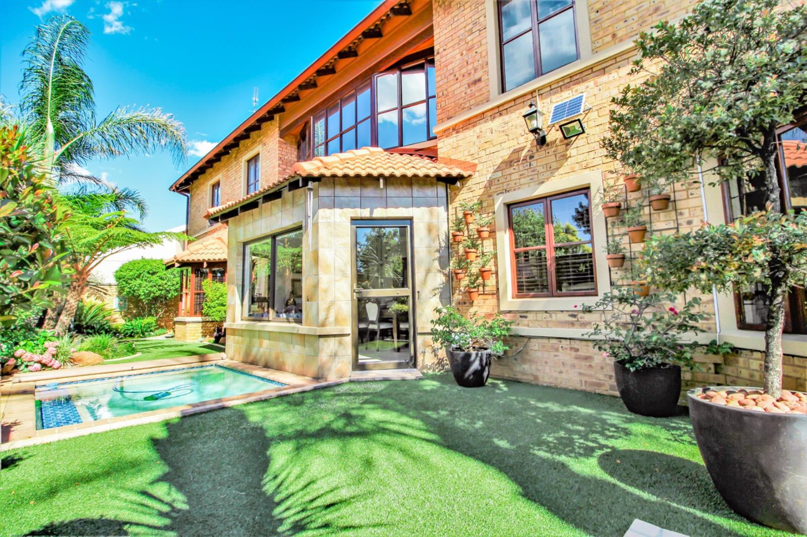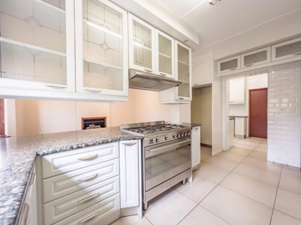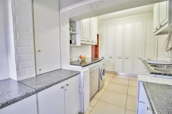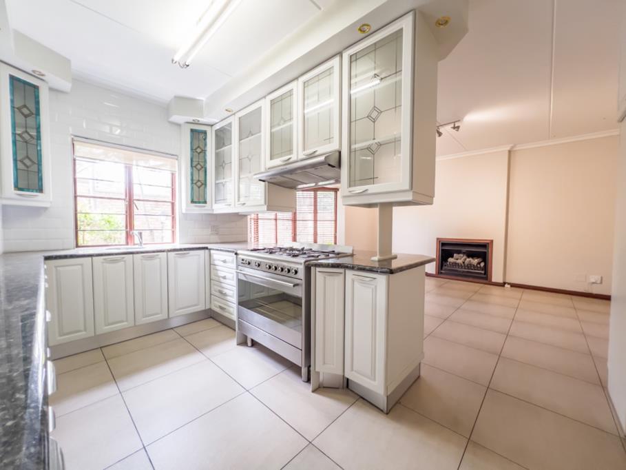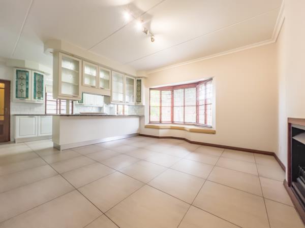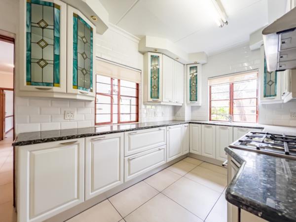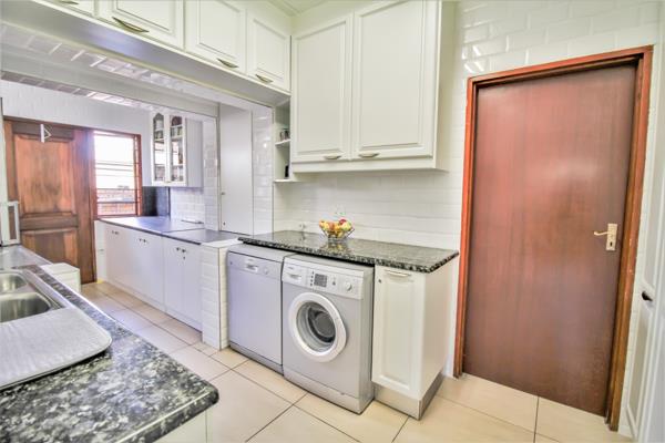 The dining area, which doubles as an entertainment space, opens onto a beautifully maintained garden featuring a solar-heated pool and a braai corner, making this the ideal space to entertain or relax and enjoy the tranquil surroundings.