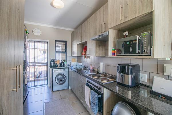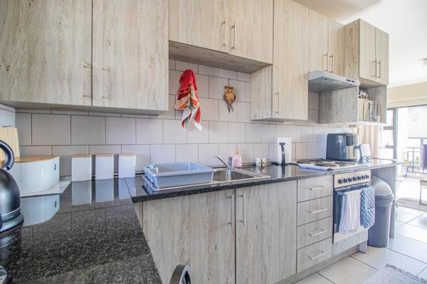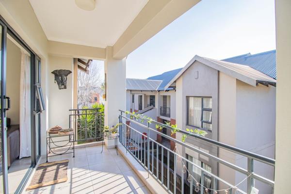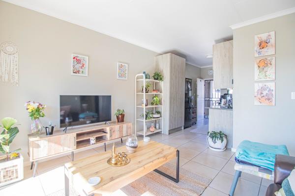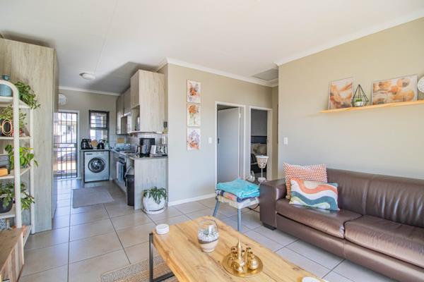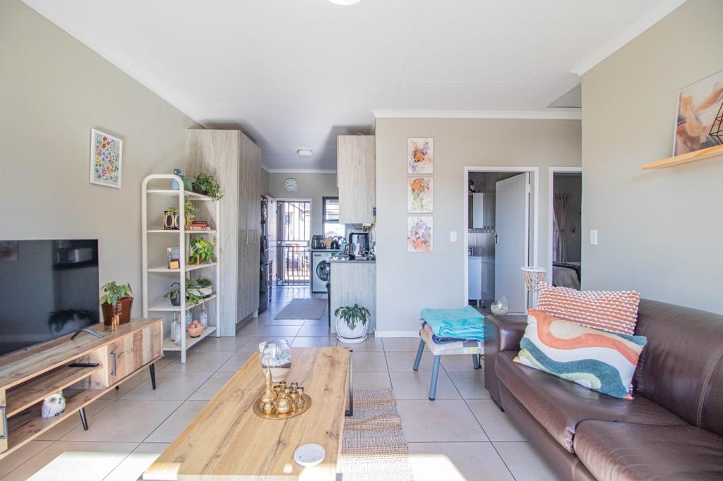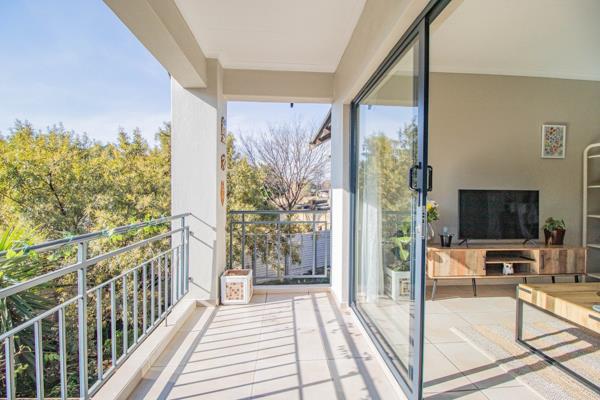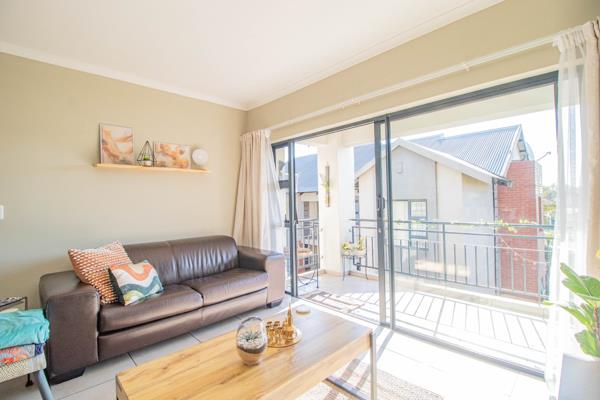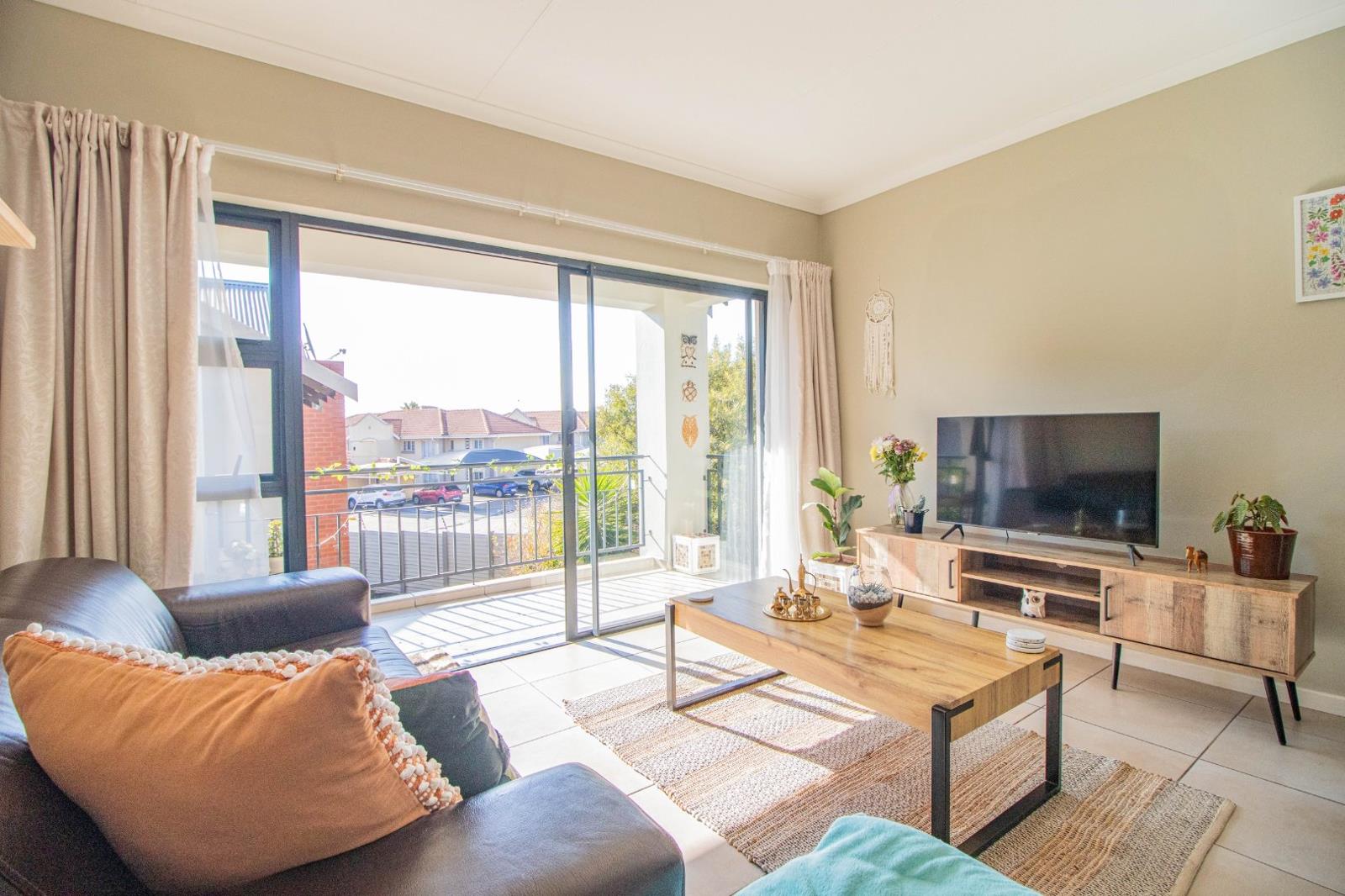 Step into a spacious open-plan living area seamlessly connecting the kitchen and living room. The living room opens onto a covered balcony, perfect for relaxing or entertaining.