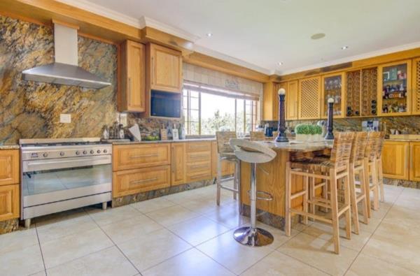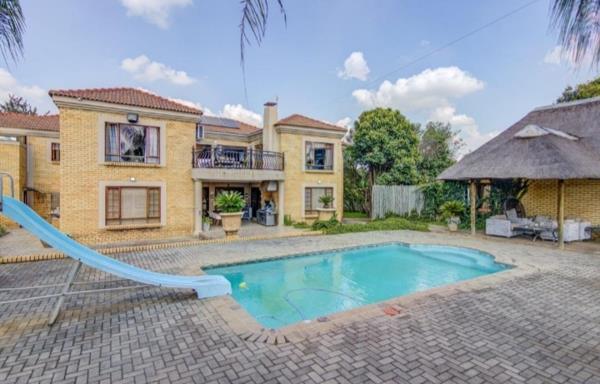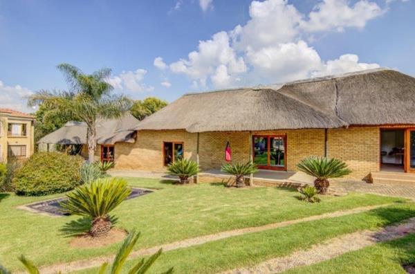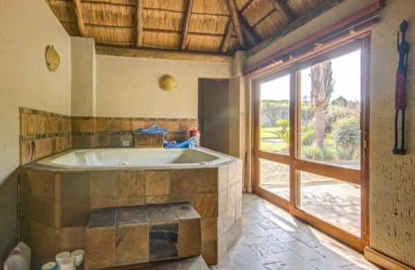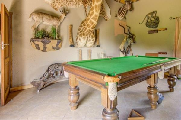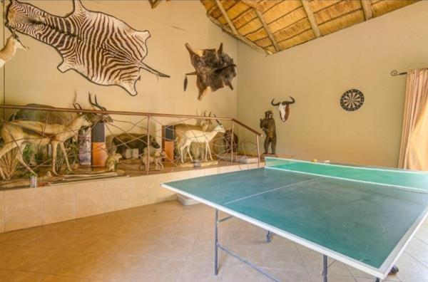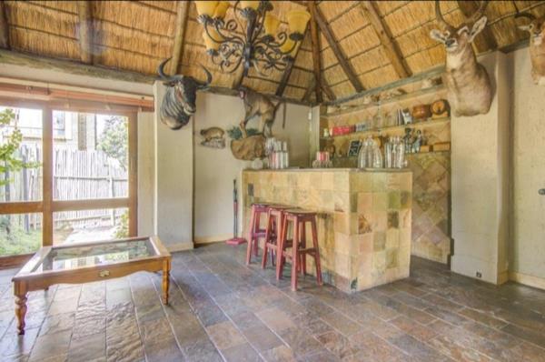 Lovely holiday-feel thatch roof entertainment area with it''s own patio overlooking the sparkling swimming pool and luscious garden. Boma/firepit, built in bar, bathroom with shower, basin and toilet, huge snooker/pool room, jacuzzi room, Bachelors flat and storeroom (288 sqm under roof).