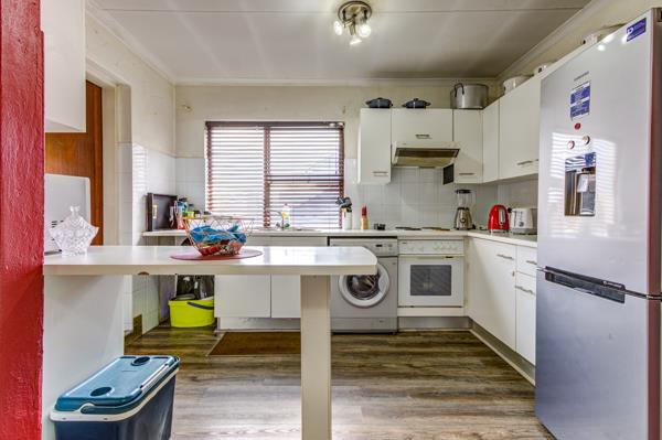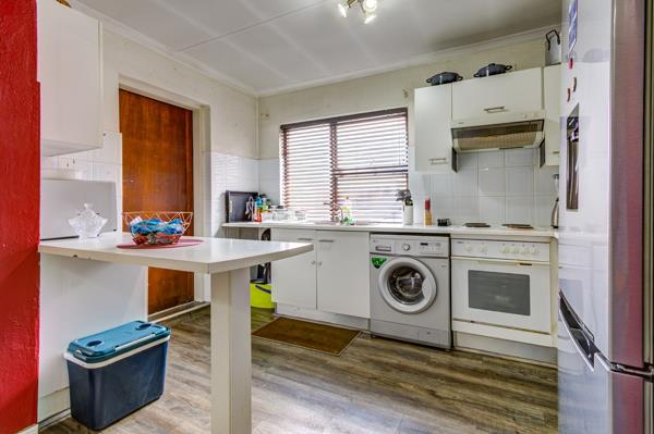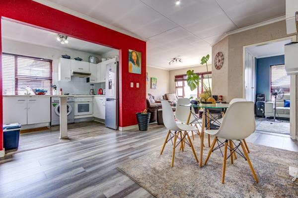 Step inside and youll immediately feel the spaciousness of the open-plan living, dining, and kitchen areas. The modern grey laminate flooring ties everything together beautifully, creating a seamless flow. The living room is super bright thanks to those big sliding glass doors that lead right out to your own private patio imagine enjoying your morning coffee or an evening sundowner out there! The kitchen is neat and functional with white cabinetry, integrated appliances, and a handy breakfast bar. Plus, theres a vibrant red accent wall that adds a fun pop of colour to the space.