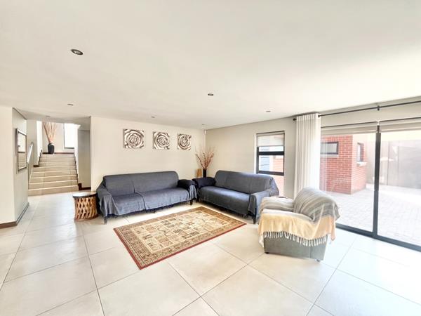 Spacious lounge area with a cozy gas fireplace, that leads onto the entertainment area with a built in braai and stacker doors leading out to the garden area.