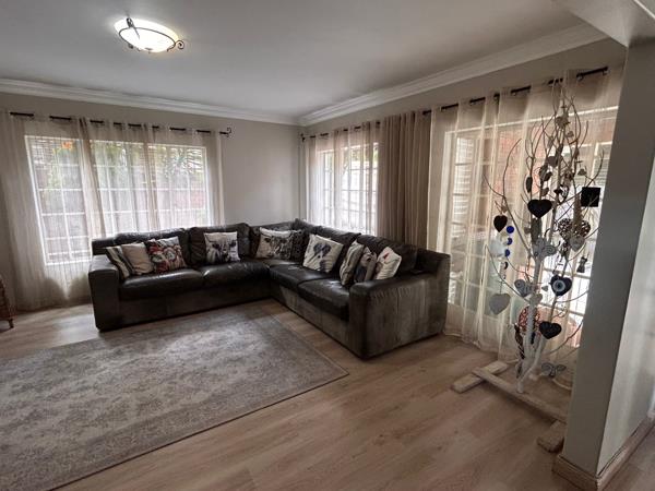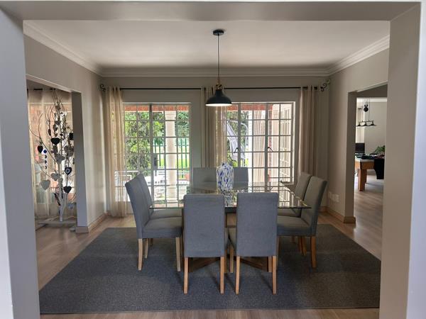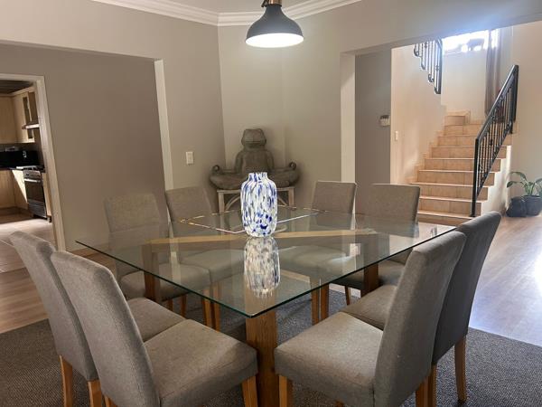 Executive living on the Golf Course, this upmarket home is welcoming and in a secure complex. Fittings and fixtures are upmarket throughout. Covered porch entrance with a superb high ceiling leading to dining area, large comfortable lounge, billiard room, family room, study and a perfectly modern fitted kitchen area. Stairway leading to a pygama lounge, spacious and inviting bedrooms, all en-suite with charming bathrooms. The home also boasts a downstairs guest loo, scullery, and maids'' quarters. The grounds are beautifully manicured, and the golf course is on your doorstep. Double garage with automated doors. Solar system and Fibre connection. An absolute must to view at this price.