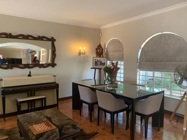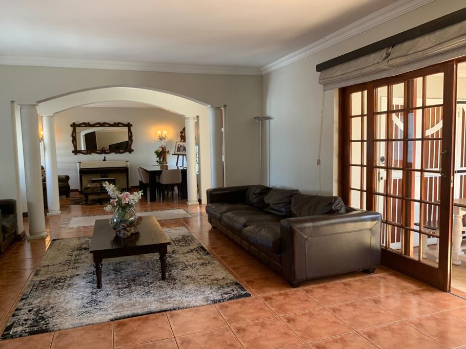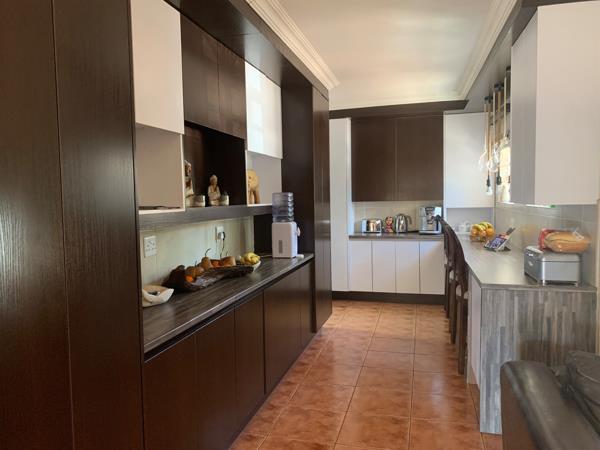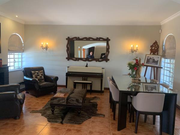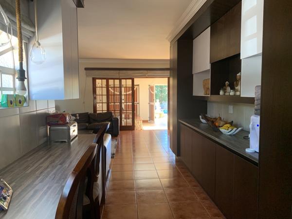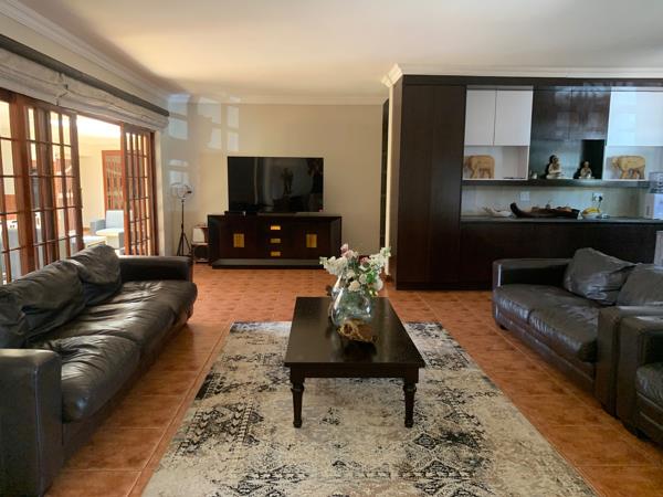 The heart of this home is an expansive living area that seamlessly flows into an open-plan kitchen and entertainment space, perfect for both lively gatherings and quiet evenings. Large doors and skylights allow the space with natural light, drawing the beauty of the pool indoors and creating a continuous connection to the outdoors, ideal for enjoying summer braais or quiet moments under the stars.