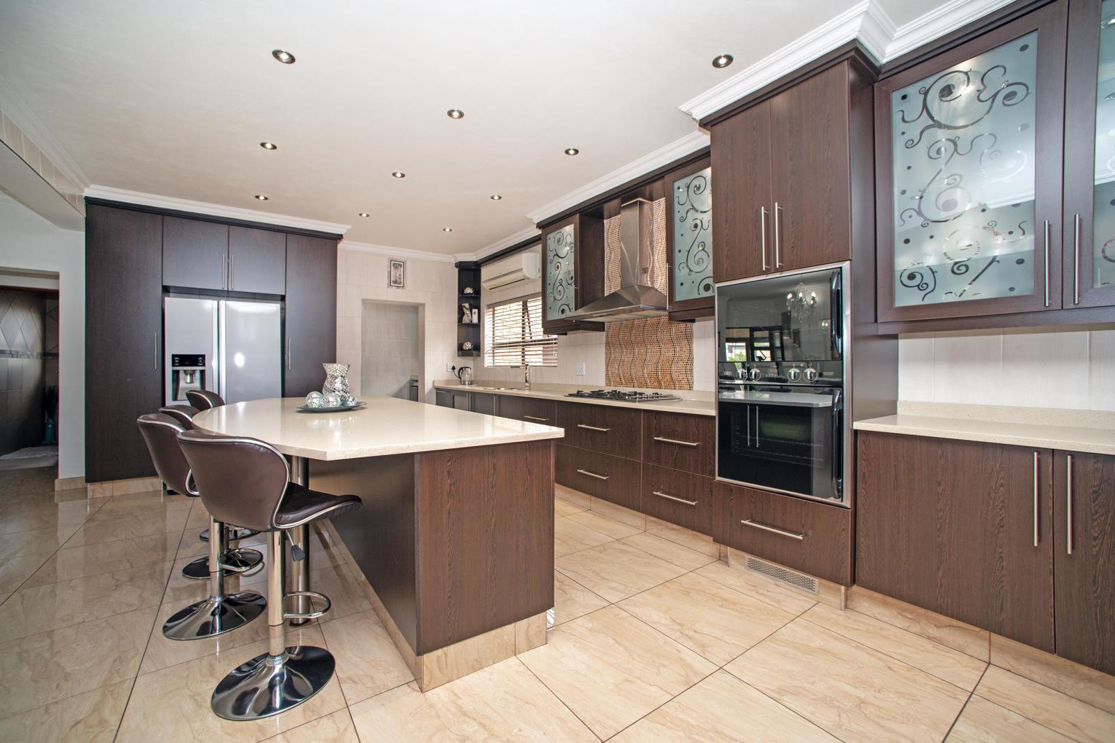 - Large modern kitchen with granite countertops, centre island, separate laundry section, and both electric and gas stoves, with direct access to the backyard