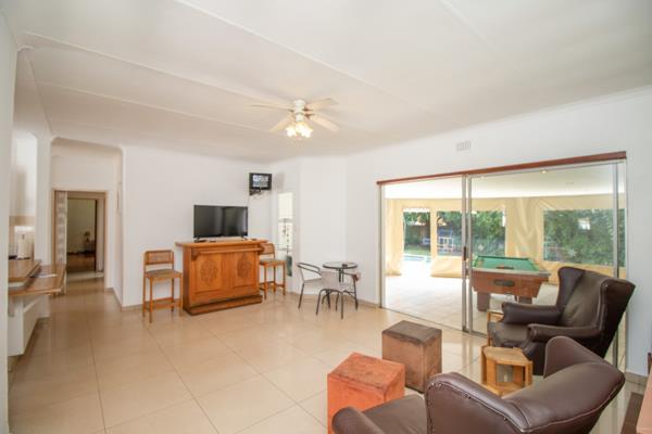The main residence features modern, neutral tiled living areas designed for practical, easy living. The open-plan melamine kitchen is complemented by a separate laundry and scullery, while the spacious lounge featuring a fireplace, dining room and family room, create a welcoming flow throughout the home. The family room opens effortlessly onto a covered patio fitted with drop blinds, overlooking a sparkling pool and jacuzzi, making it an ideal space for relaxed entertaining and everyday enjoyment.