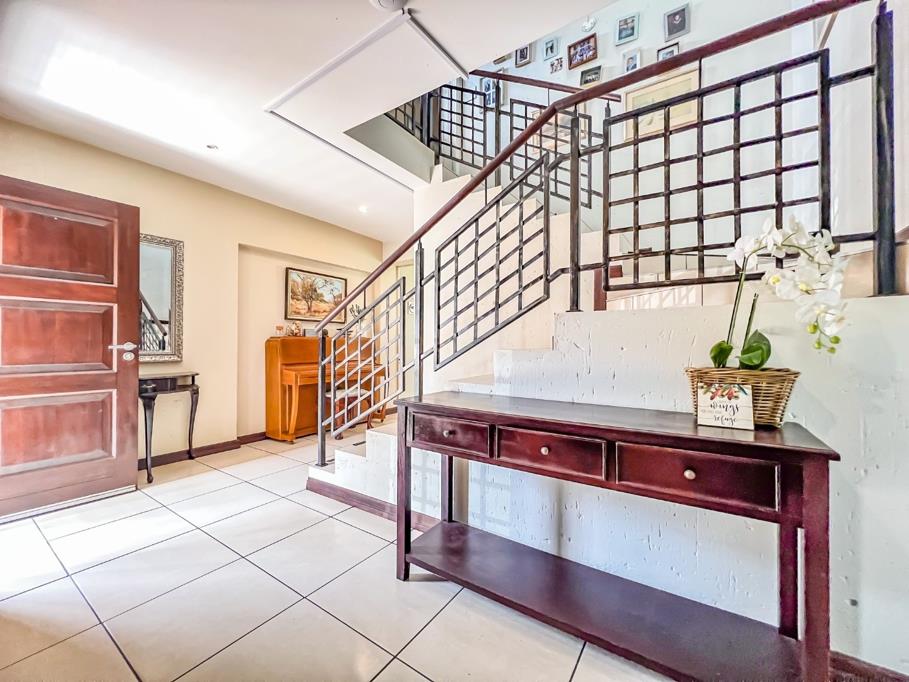 Downstairs you will find open plan living at its best. The modern kitchen includes a gas hob, space for 3 appliances and a lovely little breakfast nook. The lounge and dining area both open onto the enclosed patio that includes a built-in gas braai and overlooks the lush garden. Underfloor heating and air-conditioning keep things comfortable year-round. A separate study offers flexibility as a home office, second lounge or even a 4th bedroom, with a guest toilet adding extra convenience. Direct access from the double garage makes coming home simple and secure.