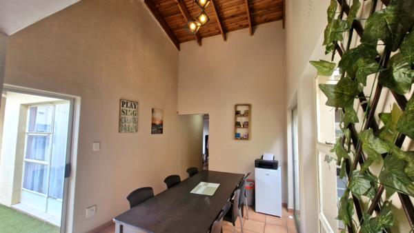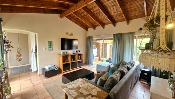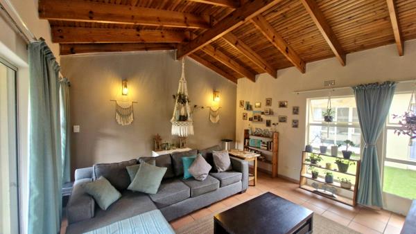 The inviting lounge is characterised by stunning high pine ceilings, creating a wonderful sense of volume and warmth. It overlooks a private front garden, immaculately maintained by the groundskeeper, offering tranquil outdoor views and added peace of mind.