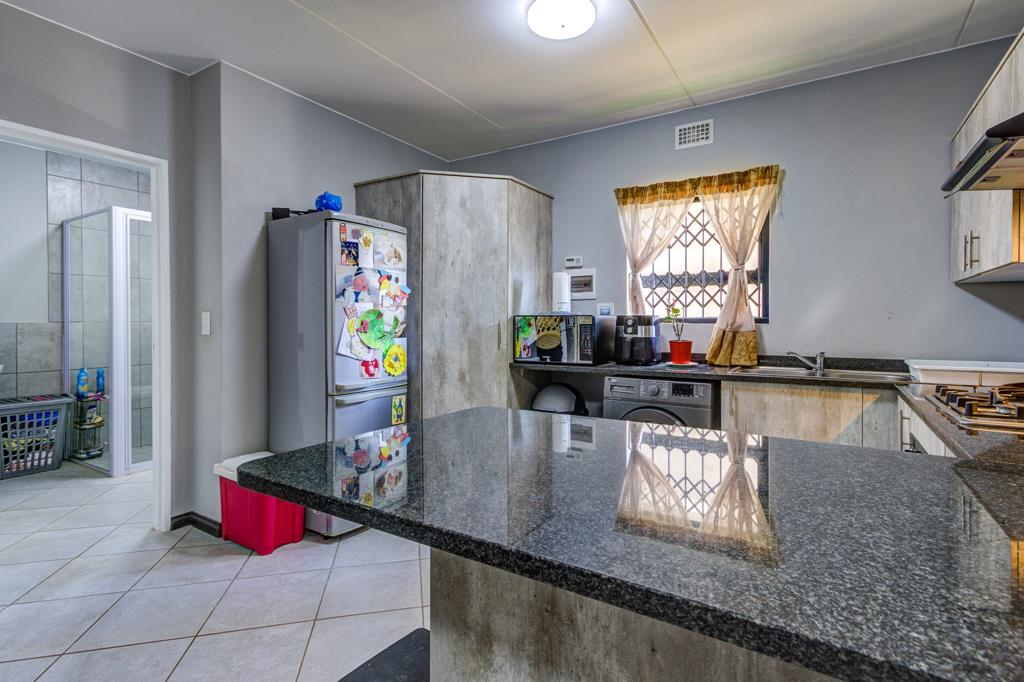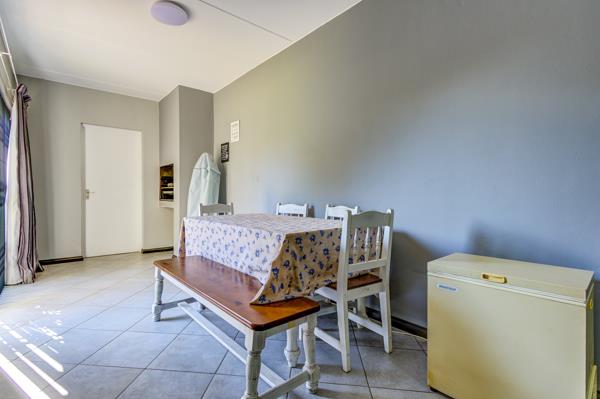 Open-Plan Kitchen andamp Lounge: Neatly tiled, the modern kitchen offers plenty of cupboard space, a breakfast counter, and space for undercounter appliances