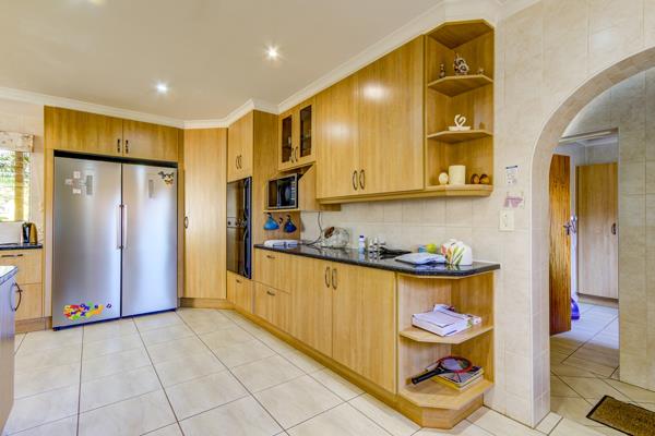 Flowing seamlessly from the kitchen is a generous open-plan living and dining area, which opens onto a large patio via dual aluminium sliding doors. Here, youll find a built-in braai and a sparkling, heated swimming pool surrounded by lush, rolling lawnsideal for outdoor gatherings or peaceful relaxation.