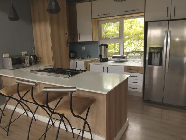 It has a spacious open-plan living area that combines the lounge and dining room, as well as a stunning kitchen with a scullery. The large sliding doors enhance the aesthetic appeal of the house.