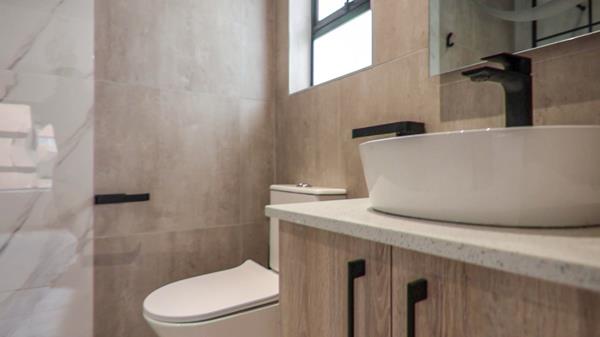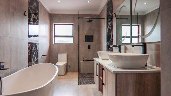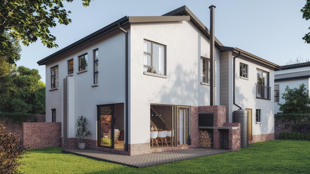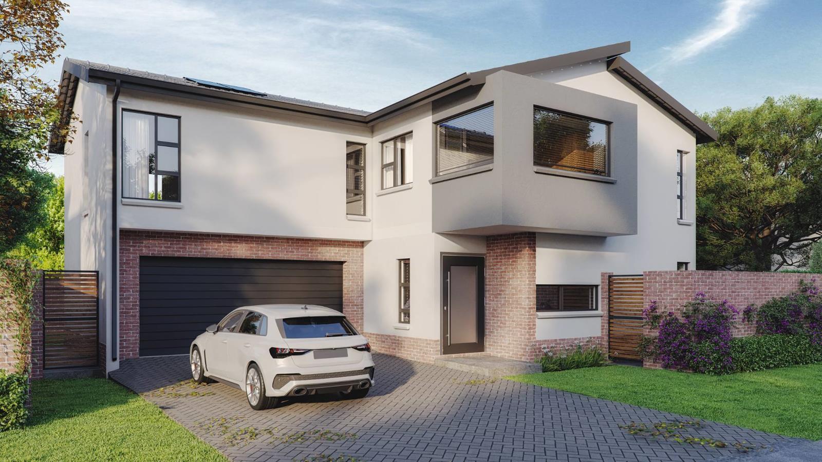 The design of the house is a coachman style, making provision for solar panels. Provision has been made for an inverter system. The north facing roof elevation is perfect for going off the grid. A very modern colour scheme with grey double roman roof tiles, set off with a stone colour plaster and charcoal aluminium window frames. The front and kitchen doors are also aluminium. Maximum usage of glass to make use of the high ceilings and abundance of natural light.