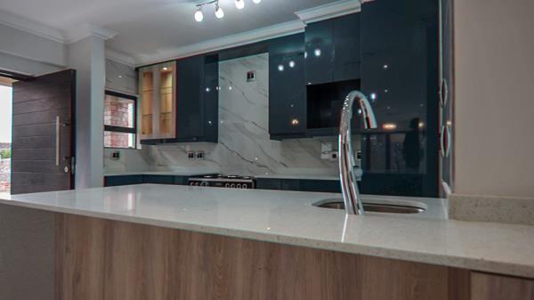 The kitchen is state of the art with your own choice of cabinet colours with cupboards to the ceiling. Counter tops are sigma quartz. Modern island with a gas hob.