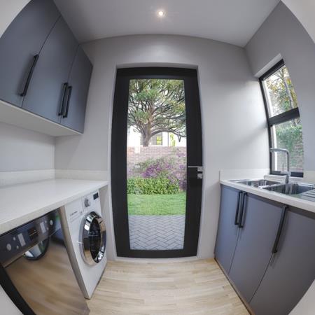 The downstairs area flows into the dining room opening up via stacking doors onto a north facing private garden. Down lights complete the picture. Guest bathroom.