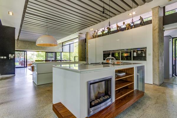 The designer kitchen is both functional and elegant, offering sleek white cabinetry, integrated appliances, and a central island with a striking wood accent ideal for family living and entertaining. Pendant lighting and refined finishes elevate the space into a true showpiece.