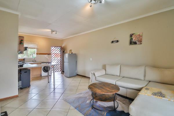 The open-plan kitchen with gas stove flows seamlessly into the lounge, leading to a covered balcony, featuring a built-in braaiperfect for entertaining or simply unwinding.