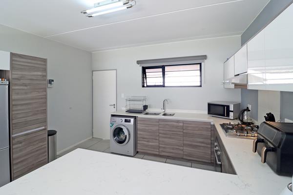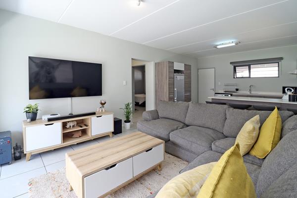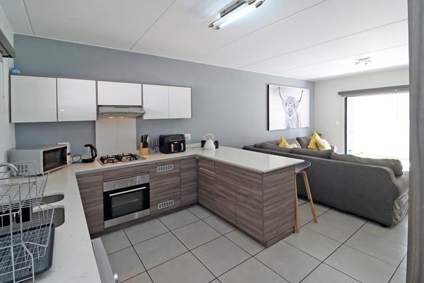 Discover modern living in this meticulously designed 2-bedroom, 1-bathroom ground-floor unit, perfectly situated in the desirable Rynfield suburb of Benoni. Spanning a comfortable 73 sqm, this residence offers a contemporary open-plan layout that seamlessly integrates the lounge and kitchen areas, creating an inviting atmosphere for daily living and entertaining. The kitchen boasts modern wood-look and glossy white cabinetry, light countertops, an integrated gas hob and oven, and a convenient breakfast bar, complemented by tiled flooring throughout.