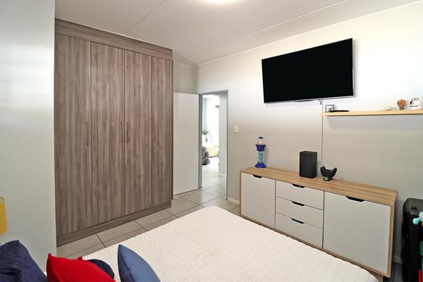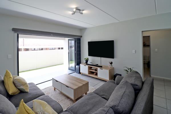 The living space extends effortlessly outdoors through large bi-fold doors, leading to a private, low-maintenance patio. This outdoor sanctuary features artificial turf and a covered built-in braai area, ideal for alfresco dining and relaxation. Both bedrooms are well-appointed with spacious built-in wardrobes, offering ample storage and a clean aesthetic, while the single bathroom is designed for functionality.