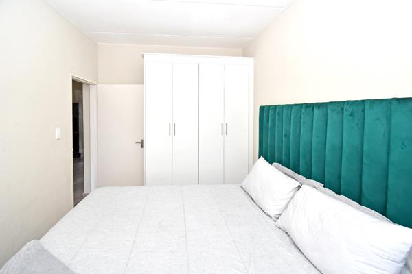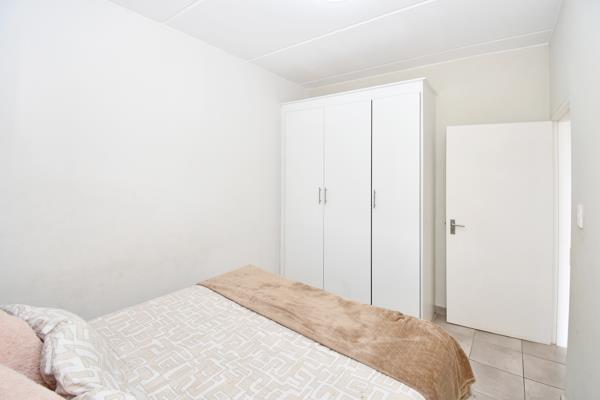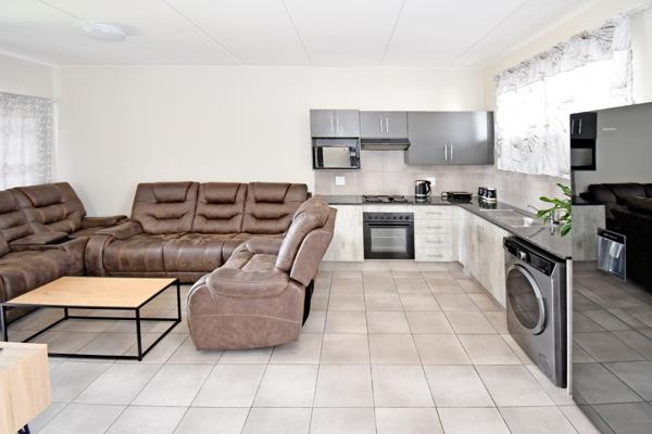 This modern 2-bedroom, 1-bathroom apartment offers comfortable living within a secure complex in Benoni. The open-plan layout seamlessly connects the living and dining areas with a contemporary kitchen, creating an inviting space for relaxation and entertaining. The kitchen is a highlight, featuring stylish grey upper and light wood-toned lower cabinetry, complemented by dark granite countertops. It comes fully equipped with integrated appliances including an oven, hob, extractor fan with space for a washing machine, all set on practical tiled flooring that extends throughout the unit.