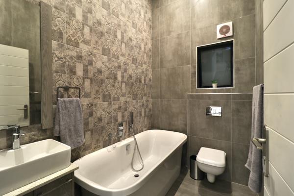 Exquisite fully tiled bathrooms with modern vanity units and mirrors