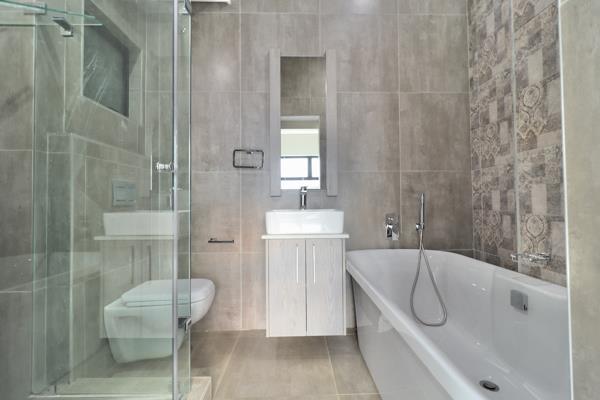 Exquisite fully tiled bathrooms with modern vanity units and mirrors