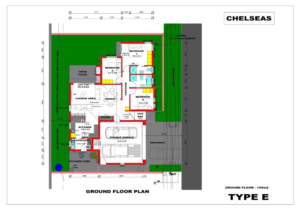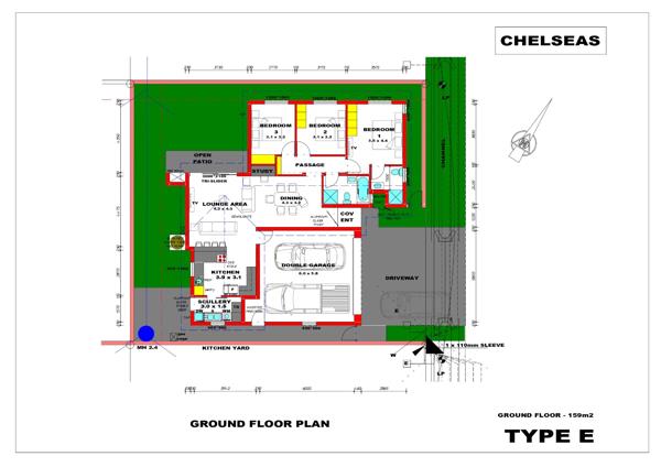 Plan E andamp F - Single Storey - 159m2 - R3 022 , 000 - 3 Bedrooms, 2 bathrooms, study nook, kitchen, scullery, living room, double garages.