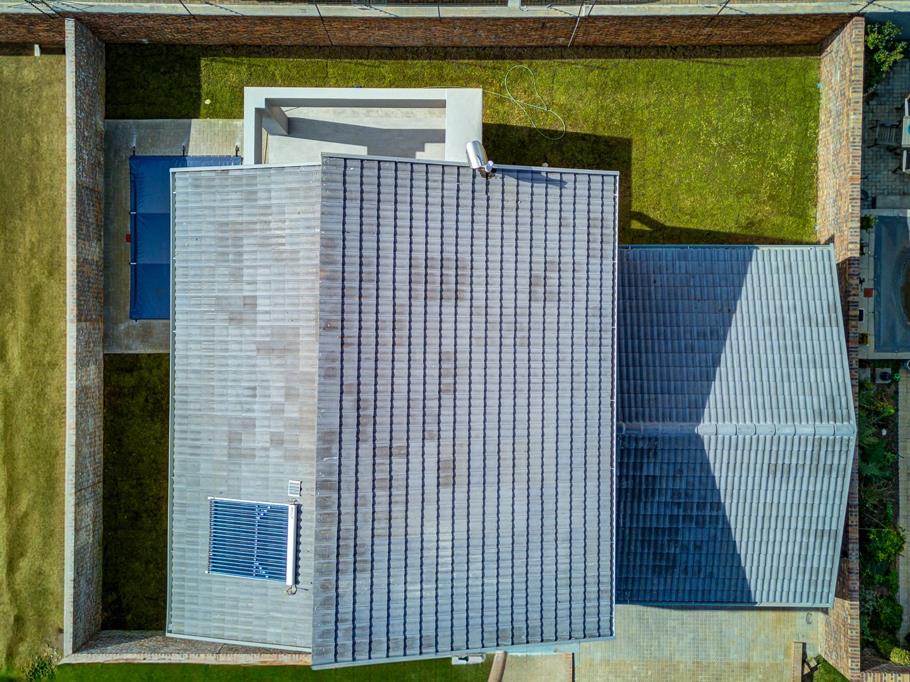 The design of the house is a coachman style making provision for an inverter system. The north facing roof elevations are perfect for the addition of additional solar panels. A very modern colour scheme with grey double roman roof tiles, set off with a stone colour plaster and charcoal aluminium window frames. The front door is an aluminium pivot door.