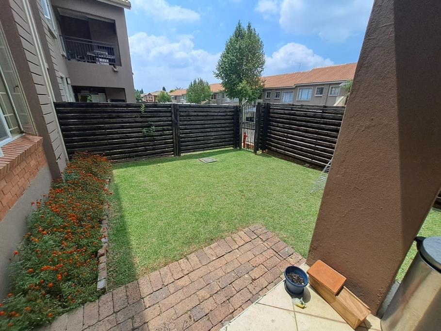 This ground-floor unit includes a enclosed garden. It has 2 bedrooms and 2 bathrooms, with the main bedroom en-suite. The kitchen features built-in cupboards, space for appliances, and an island that provides ample work and dining space. The open plan design connects the kitchen to the lounge, which leads to sliding doors and a covered patio with a built-in braai.