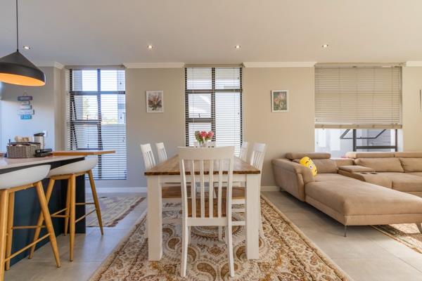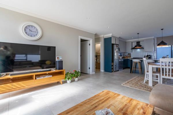The open-plan layout flows effortlessly from the lounge to the dining area and into a sleek, modern kitchen, all bathed in natural light. High ceilings and premium finishes add a sense of luxury and warmth throughout the home.