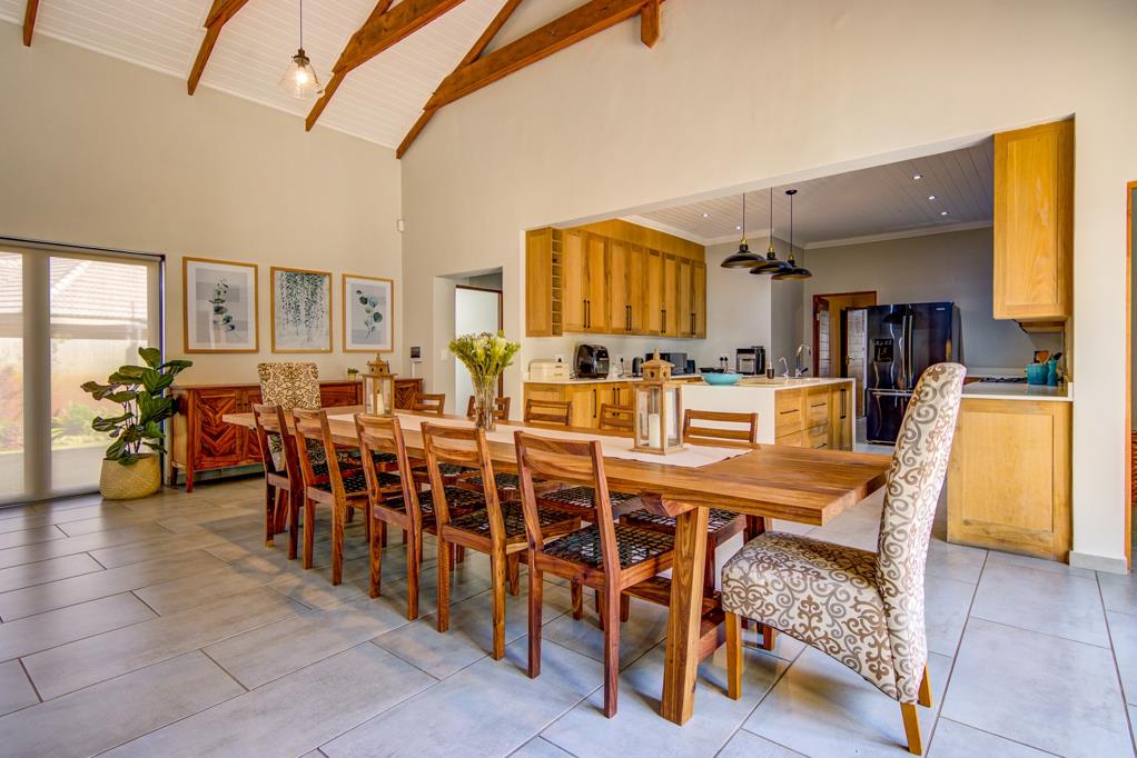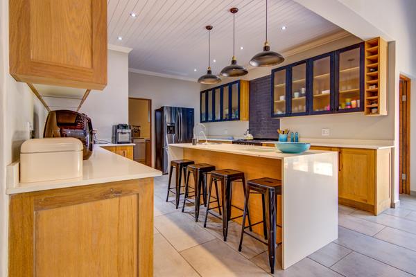 A bright, open plan living are that is exceptionally spacious flowing seamlessly into a chefs kitchen. The kitchen is fitted with top of the range tops and modern appliances, a scullery and laundry area to accommodate all the daily washing and cooking needs. The dining area opens up onto a solar heated pool, and covered patio with a built-in braai and bar. The lush green garden and sparkling blue pool provide the perfect setting for entertaining. The boma area offers the perfect setting for winter fires.