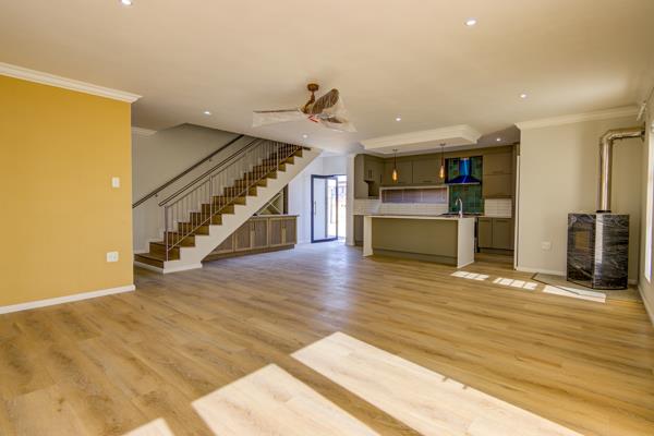 Discover modern living in this stylish 4-bedroom home located within a secure estate in Rynfield, Benoni. This contemporary residence boasts a striking grey exterior, complemented by a spacious paved driveway and a double garage, offering excellent kerb appeal. Step inside to an inviting open-plan layout, featuring two lounges and a dining room, all bathed in natural light from large sliding glass doors. The heart of the home is a modern kitchen, equipped with an island, stylish light cabinetry, a gas range, and a vibrant tiled backsplash. Wood-look laminate flooring flows throughout, enhancing the contemporary aesthetic, with clever storage integrated under the staircase. The property offers four comfortable bedrooms, including two with private en-suite bathrooms, ensuring privacy and convenience with 3.5 bathrooms in total. Enjoy seamless indoor-outdoor living with large sliding doors opening onto a covered patio, complete with a built-in brick braai ideal for entertaining. The double garage provides secure parking, while the home''s location within a security estate offers peace of mind.