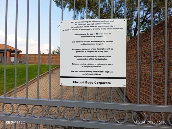 The complex have 24h security access control with electric fence. The complex have a neat swimming pool with a lapa and braai area for chilling with your friends