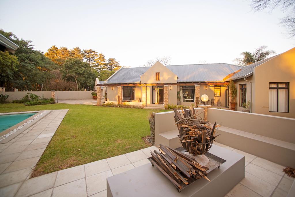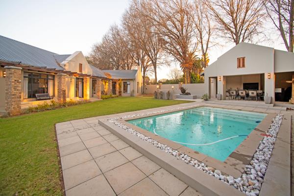 Perfectly located among large lush trees on a large 3534sqm stand in Rynfield Estates, this incredible 4 bedroom, 3.5 bathroom house will turn your head at every corner. Understated luxury and elegance, quality inclusions and designer aesthetics are seamlessly combined with supreme comfort and true livability, seldom found in todays homes. A sumptuous feeling of space is achieved by the soaring ceilings and beaming light throughout. This impeccable residence places great emphasis on entertaining in style, with a free flowing open plan design. Natural light oozes through the open plan lounge and dining area, whilst offering a breathtaking outlook over the garden, pool area, boma and entertainment area.
