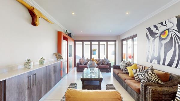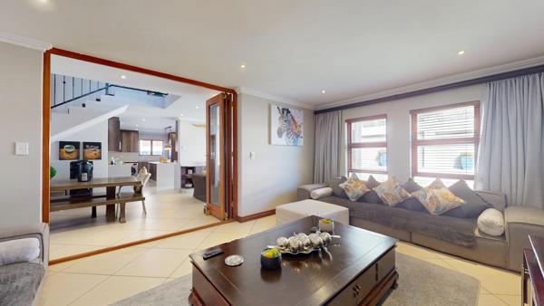 Downstairs, the home includes a private study office, guest toilet, a generously sized lounge, and an open-plan kitchen and dining area that flows effortlessly to the outdoor entertainment space. In addition there is a chill area off the dining room with aluminium stacking doors that lead to the back garden and entertainment area. Perfectly designed for entertaining and family enjoyment, the exterior of the home showcases a well-maintained swimming pool and a built-in braai area the ideal space for weekend get-togethers.