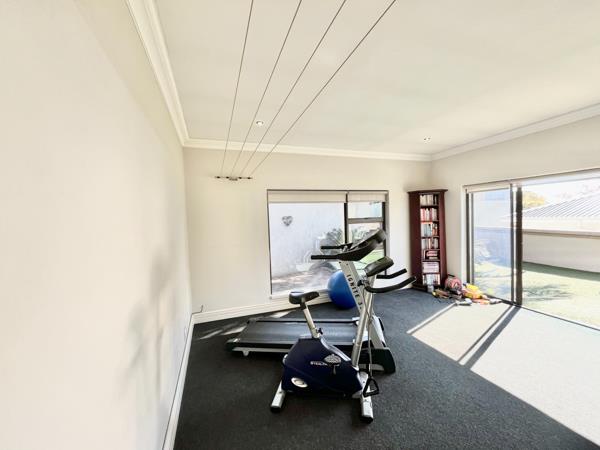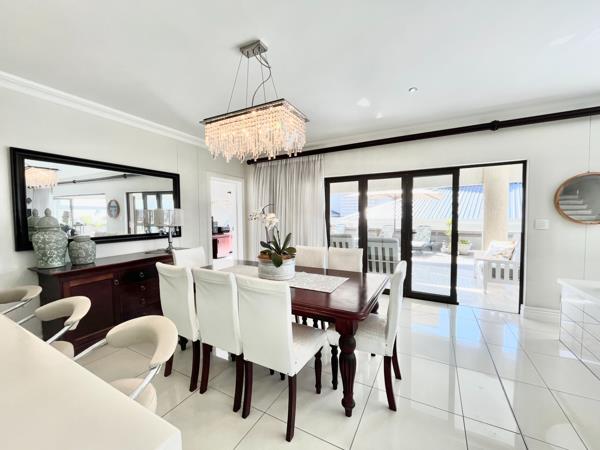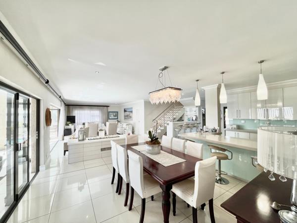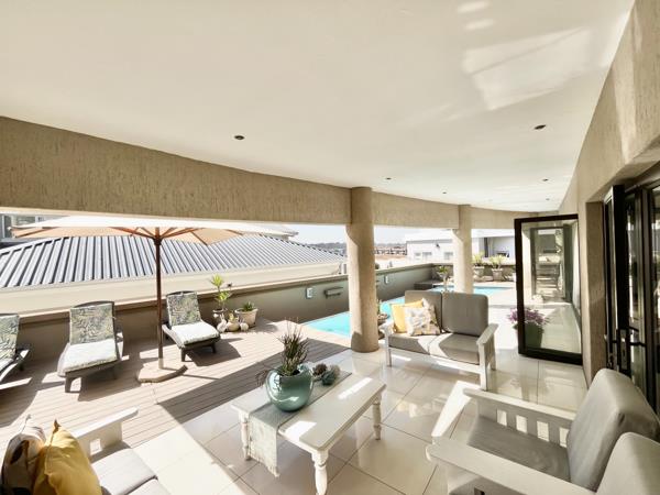 Downstairs, the expansive open-plan living area features stacking doors that flow seamlessly onto a poolside deck with lounges, creating the ultimate indoor & outdoor lifestyle. The covered patio includes a built in braai, ideal for entertaining, while the sleek indoor bar area adds a touch of sophistication. The large dining and lounge space is fully tiled and centered around a stylish gas stone fireplace, adding warmth and charm.