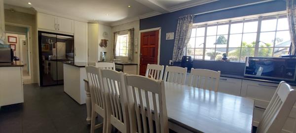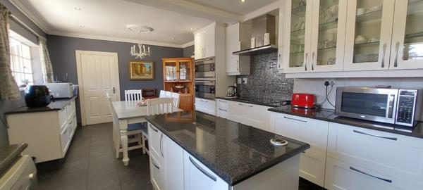 Immaculate kitchen with granite countertops, a central island, and seamless integration with the dining area.