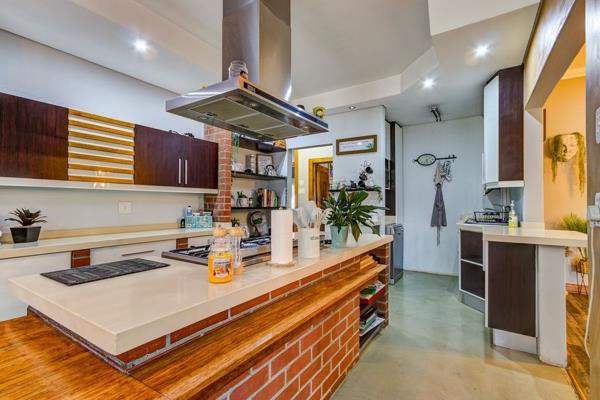 The interior boasts a seamless open-plan design, featuring two spacious lounges and a dedicated dining area. Enjoy abundant natural light, polished concrete or modern laminate flooring, and unique elements like a feature fireplace with stone and brick accents, a wood slat wall, and an integrated bar. The distinctive open-plan kitchen is a focal point, equipped with a large central island, integrated dining space, stainless steel appliances, and an industrial-rustic aesthetic with brick and wood accents, perfect for culinary enthusiasts.