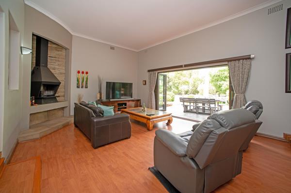 - Lounge featuring a built-in wood-burning fireplace and stacking doors, creating a warm and inviting living space