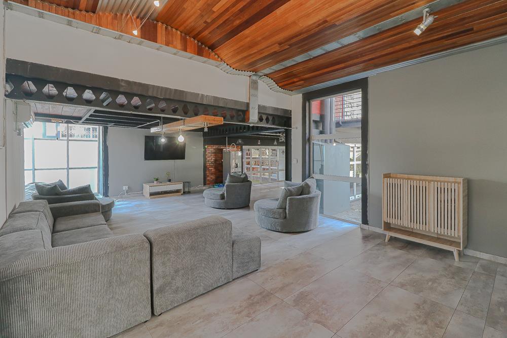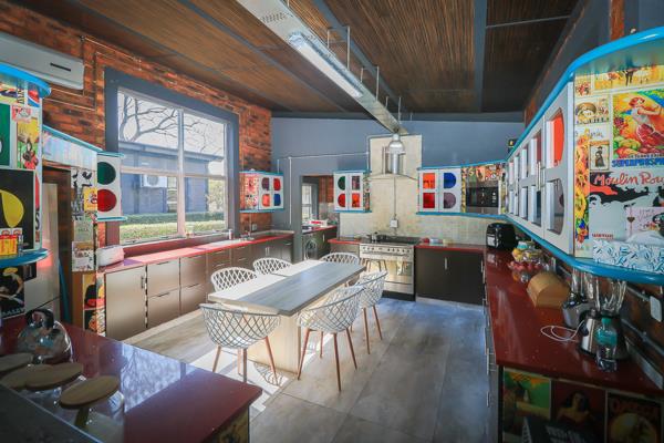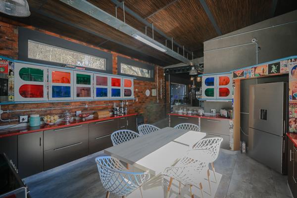At the heart of the home is a standout industrial-chic kitchen that perfectly marries character with functionality. Dark brown cabinetry with sleek silver handles contrasts beautifully with bold red countertops, while a stainless-steel induction stove with a black glass top anchors the space. A vibrant teal shelf above the cabinets adds a creative pop, housing a microwave and stylish storage against exposed brick walls. Large light-grey marble-effect tiles, exposed conduit lines, and vintage wall art complete the modern-retro aesthetic. A separate scullery and washing-up area ensure practicality without compromising on style, and the kitchen flows seamlessly into the lounge and dining areasideal for entertaining.